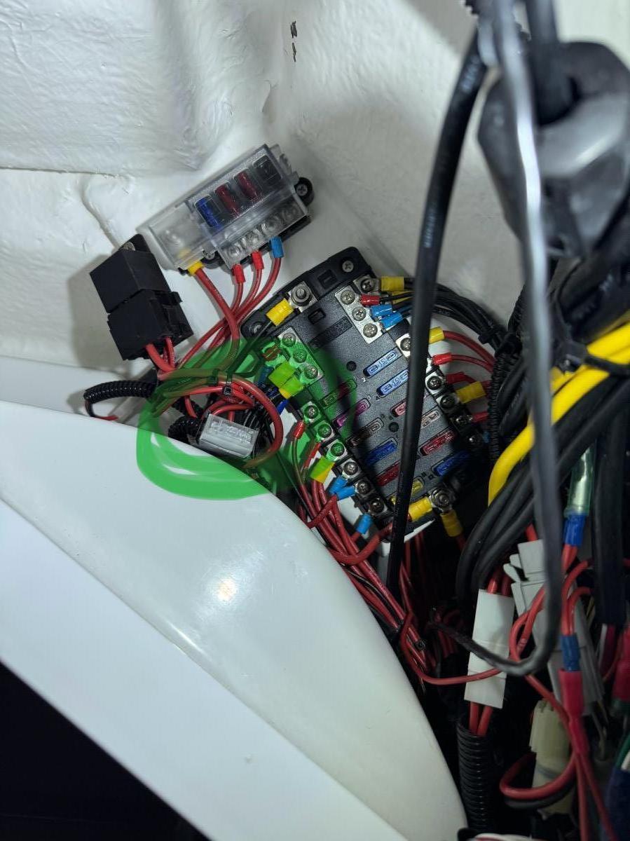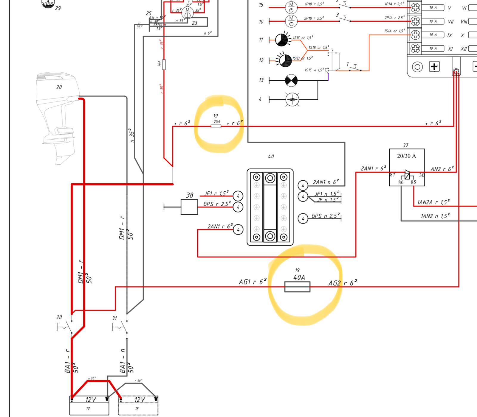 Je me suis donc penché sur le schéma électrique pour essayer de voir s’il y avait un master fusible sur ce circuit. Si je comprends bien, il y a une double alimentation du tableau à fusibles, l’une avec un fusible 25A, et l’autre avec un 40A - et ce sont tous les accessoires connectés à cette boite qui sont en défaut. Je ne comprends pas trop cette double alimentation a moins qu’il n’y ait pas dans le commerce de fusibles 65 ampères, mais bon… La défaillance d’un de ces fusibles pourrait selon ma logique être une piste, puisque le guindeau a son propre circuit d’alimentation, sans passer par la boite à fusibles.