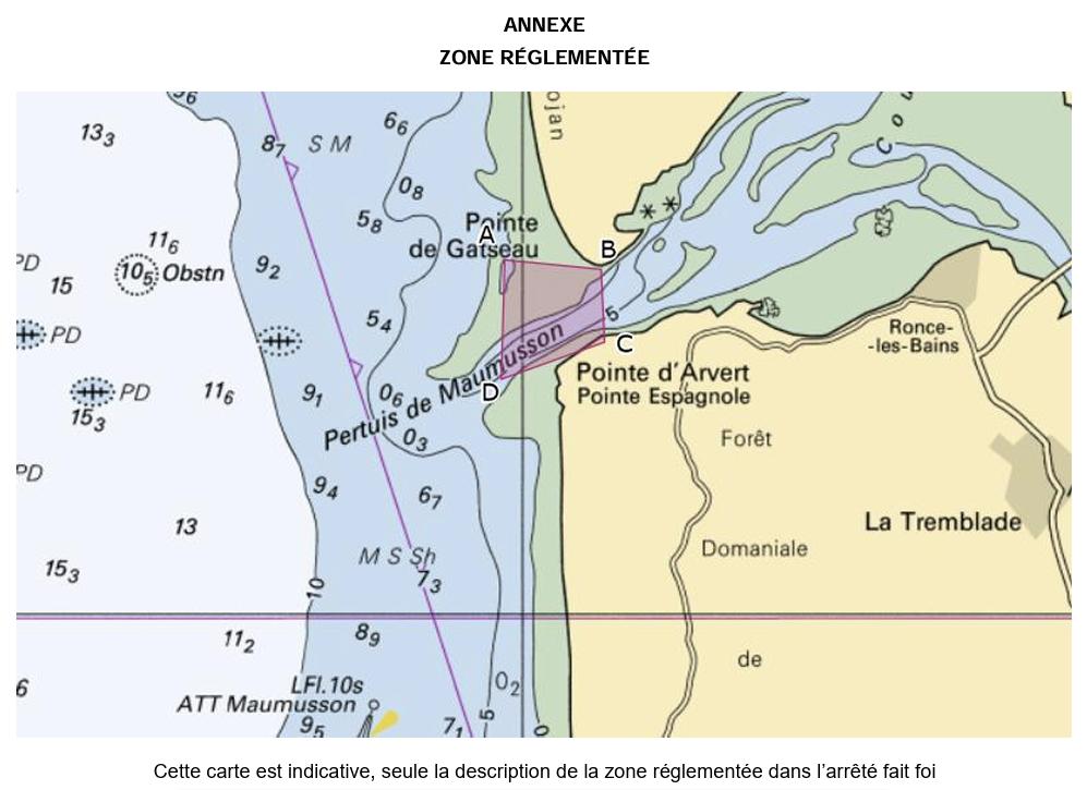 La navigation des navires de plaisance est interdite dans le secteur de la passe de Maumusson située entre les communes de la Tremblade et de Saint-Trojan-les-Bains. Cette interdiction, en vigueur tant que l’obstruction du chenal et l’impossibilité de le baliser seront constatés, s’exerce dans la zone définie par les points dont les cordonnées sont :
