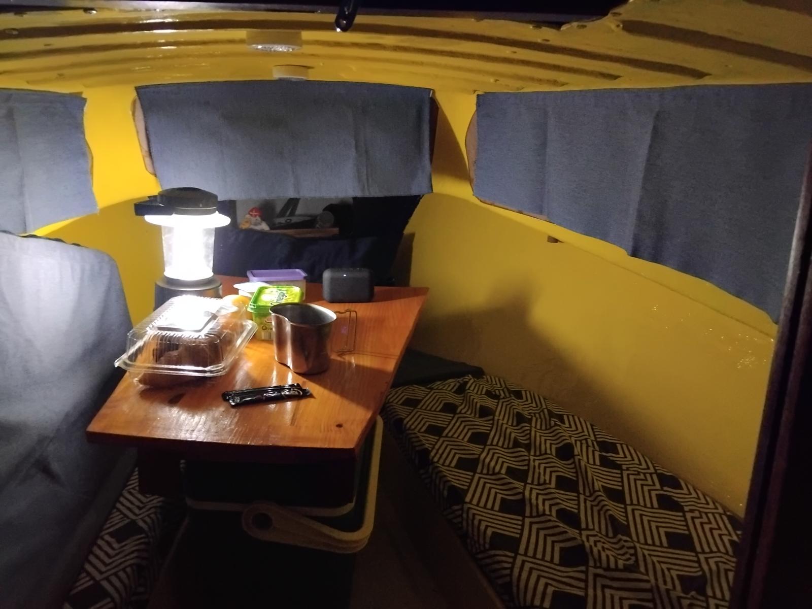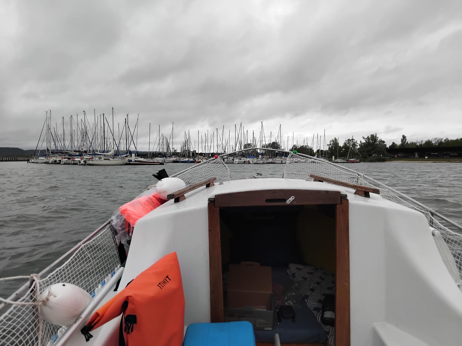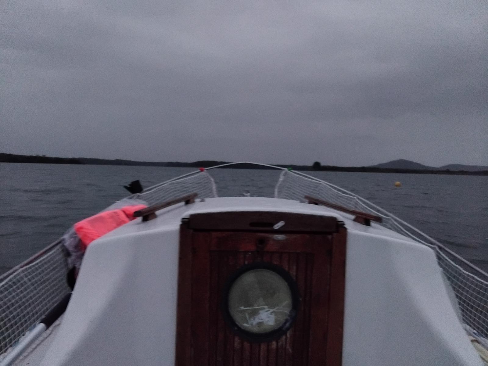 Çà y est, le bateau est à l'eau, au port. La peinture est sèche, le cockpit est briqué, les batteries chargées, la cabine rangée, la glacière remplie. En avant, vers l'infini et au delà! Bon, pour le moment, on va se contenter d'une petite sortie en début de soirée, histoire de tester la nouvelle batterie.  Le moteur de 65lbs fait le travail (il faudra que je récupère la montre gps de mon épouse pour connaître ma vitesse exacte), je me promène entre le port, le déversoir et l'île du bois Gérard. La nuit arrive, il est largement temps de rentrer au port. J'appréhende un peu la manœuvre d'accostage, nouveau bateau, nouveau port, pas l'habitude... Heureusement, malgré une très légère prise au vent, la manœuvre se passe sans problème, tout doux, tranquillement, en finesse. La batterie qui affichait 13v au départ affiche 12,8 après 30min de navigation à fond (à fond, c'est relatif...  )  Il est l'heure maintenant de tester la cabine. J'ai stocké la nourriture dans une glacière qui fait également office de support à la table. L'heure du repas, j'avais prévu des sardines à l'huile, et du riz (que j'ai fait cuire chez moi, ainsi que le poisson, du lieu noir). Le tout arrosé d'un Sancère. Un petit réchaud à gaz fait parfaitement l'affaire pour réchauffer la tambouille.  Après le repas, il faut un peu se contorsionner pour sortir la glacière et installer le plateau de la table en mode support de coussin. Il est installé entre les deux couchettes avec un coussin de la même épaisseur que celles-ci, ce qui fait un lit tout à fait correct. Le petit plafonnier fournis assez de lumière pour lire ("Histoire de traverser" de Bruno Sananès, l'auteur à traversé la France sur ses canaux sur un bateau de 4m). Ceci dit, il faudra que je rajoute 2 ou 3 plafonniers (sans que ce soit Versailles, mais j'aime voir clair et attirer les petits insectes volants nocturnes) Pour les commodités, au cas ou, on en revient au bon vieux système du pot de chambre   Après une bonne nuit de sept heures, bercé par le lac et les drisses des voiliers, il est l'heure du petit déjeuner. Je replie le sac de couchage qui fait un excellent dossier, je réinstalle la glacière dans la cabine qui sert de nouveau de support de plateau de table, on ressort le réchaud, le café chauffe, le pain au chocolat est fidèle au poste   Une petite vaisselle et hop, on repart sur l'eau. Je repars dans le même secteur que la veille. Je me laisse le temps de découvrir le lac. Je croise deux pêcheur et un windfoil qui profite des rafales à 20 nœuds pour se faire plaisir. Vie de famille oblige, il est déjà l'heure de rentrer. L'accostage se fait sans problème, on range le bateau et on attend avec impatience une prochaine sortie