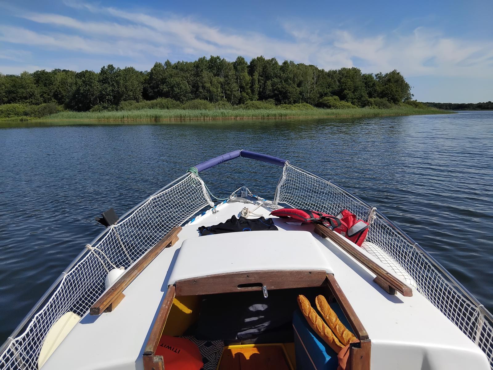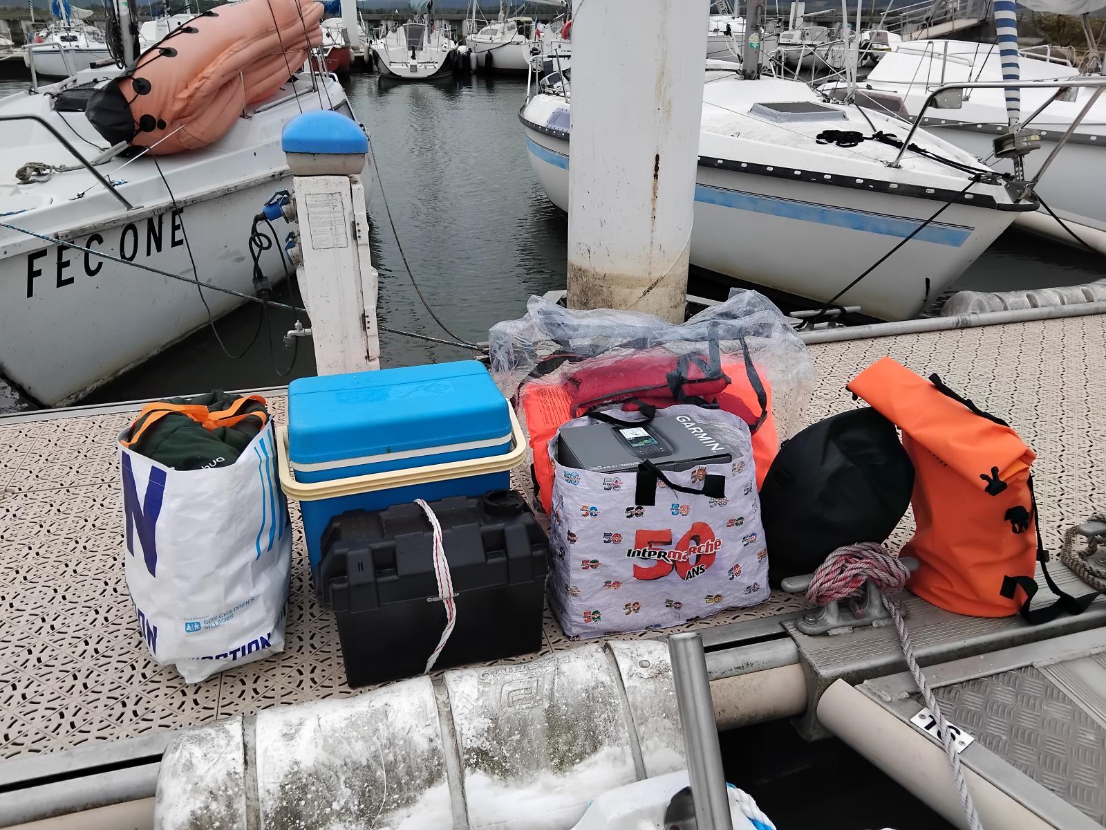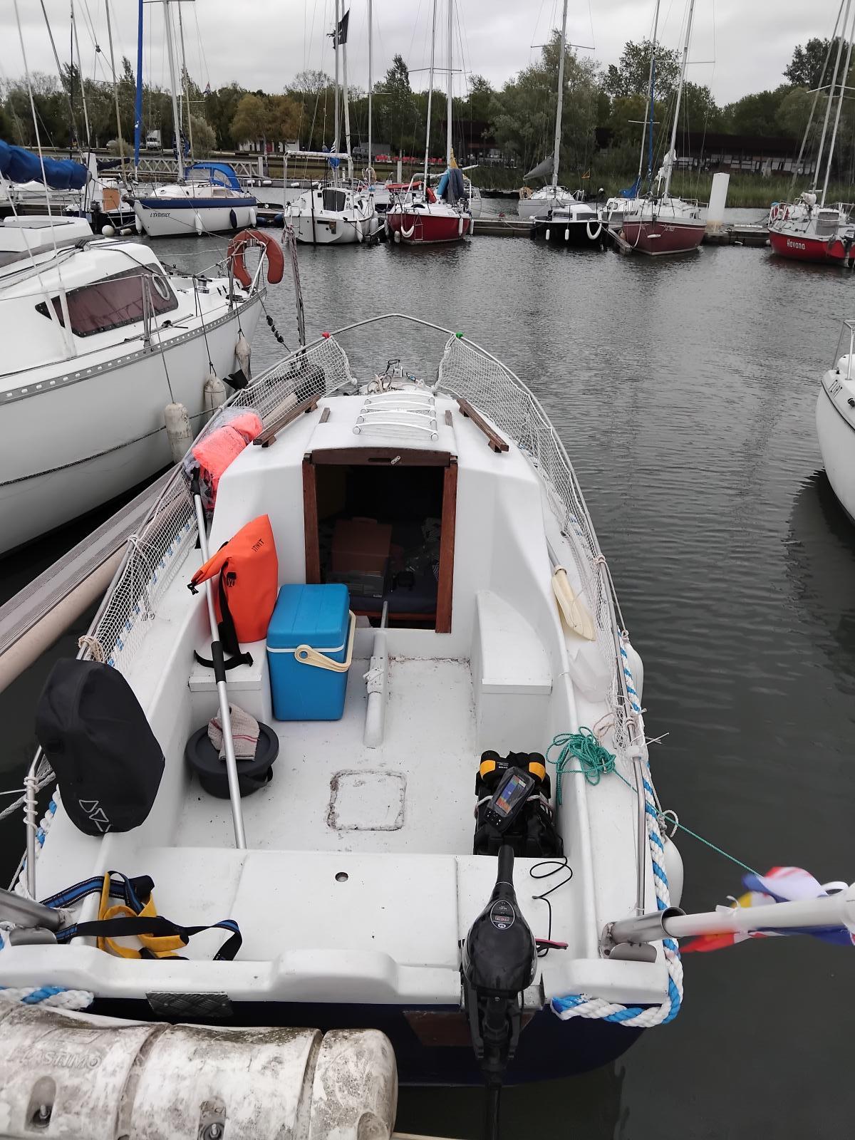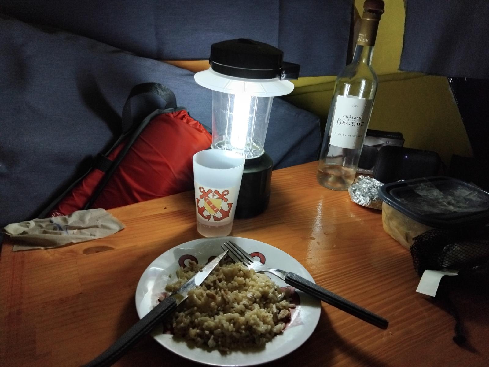Çà y est, le bateau est à l'eau, au port. La peinture est sèche, le cockpit est briqué, les batteries chargées, la cabine rangée, la glacière remplie. En avant, vers l'infini et au delà! Bon, pour le moment, on va se contenter d'une petite sortie en début de soirée, histoire de tester la nouvelle batterie.  Le moteur de 65lbs fait le travail (il faudra que je récupère la montre gps de mon épouse pour connaître ma vitesse exacte), je me promène entre le port, le déversoir et l'île du bois Gérard. La nuit arrive, il est largement temps de rentrer au port. J'appréhende un peu la manœuvre d'accostage, nouveau bateau, nouveau port, pas l'habitude... Heureusement, malgré une très légère prise au vent, la manœuvre se passe sans problème, tout doux, tranquillement, en finesse. La batterie qui affichait 13v au départ affiche 12,8 après 30min de navigation à fond (à fond, c'est relatif...  )  Il est l'heure maintenant de tester la cabine. J'ai stocké la nourriture dans une glacière qui fait également office de support à la table. L'heure du repas, j'avais prévu des sardines à l'huile, et du riz (que j'ai fait cuire chez moi, ainsi que le poisson, du lieu noir). Le tout arrosé d'un Sancère. Un petit réchaud à gaz fait parfaitement l'affaire pour réchauffer la tambouille.  Après le repas, il faut un peu se contorsionner pour sortir la glacière et installer le plateau de la table en mode support de coussin. Il est installé entre les deux couchettes avec un coussin de la même épaisseur que celles-ci, ce qui fait un lit tout à fait correct. Le petit plafonnier fournis assez de lumière pour lire ("Histoire de traverser" de Bruno Sananès, l'auteur à traversé la France sur ses canaux sur un bateau de 4m). Ceci dit, il faudra que je rajoute 2 ou 3 plafonniers (sans que ce soit Versailles, mais j'aime voir clair et attirer les petits insectes volants nocturnes) Pour les commodités, au cas ou, on en revient au bon vieux système du pot de chambre   Après une bonne nuit de sept heures, bercé par le lac et les drisses des voiliers, il est l'heure du petit déjeuner. Je replie le sac de couchage qui fait un excellent dossier, je réinstalle la glacière dans la cabine qui sert de nouveau de support de plateau de table, on ressort le réchaud, le café chauffe, le pain au chocolat est fidèle au poste   Une petite vaisselle et hop, on repart sur l'eau. Je repars dans le même secteur que la veille. Je me laisse le temps de découvrir le lac. Je croise deux pêcheur et un windfoil qui profite des rafales à 20 nœuds pour se faire plaisir. Vie de famille oblige, il est déjà l'heure de rentrer. L'accostage se fait sans problème, on range le bateau et on attend avec impatience une prochaine sortie