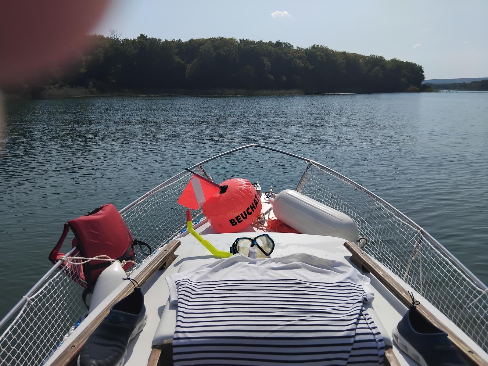 Bonjour à tous. L'été est terminé et avec lui les belles promenades ensoleillées et les soirées tempérées (et sèches). J'ai bien profité de mon bateau, beaucoup de petites promenades de 2/3 heures, agrémentées de poses pour se baigner, faire du masque à la recherche des silures (que je n'ai pas encore vus mais çà viendra), tester de nouveaux matériels (j'ai acheté un sondeur car par endroit le lac est vraiment peu profond l'été). Et surtout les premières petits navigation de ma plus grande fille et une soirée passée en solo, tranquille  Sans oublier le jour ou nous avons coupé le Macoui    Nettoyage (certes approximatif) de la coque au balais brosse avec masque et tubas L'aide précieuse d'un petit mousse en vigie   Le hublot de la porte que j'ai cassé malencontreusement...  Pose des rideaux avant une sortie de nuit  Départ au crépuscule pour arriver avant la nuit à l'une des 3 bouées d'amarrage disposées au sud du lac  Petit repas du soir : Saumon en croute, puis riz fris à l'ail accompagné de sardines (recette trouvée au pif sur internet, et plutôt bon en fait malgré un doute initial), fromage et tarte aux brimbelles (on est pas si loin des Vosges)  Un petit schlouk pour bien dormir   Et au lit avec un bon bouquin (un livre d'Alexandre Jubelin sur le combat naval au XVIIe siècle)  Réveil à la fraiche, je ne dois pas rentrer trop tard à la maison  Petit déjeuner (avec croissant) et un bon café chaud  Le jour s'est levé sur le lac, le ciel a une jolie couleur rosée  Je profite du retour pour tester mon sondeur, je ne connais pas encore bien le fonctionnement, ça viendra. Mais j'ai l'essentiel pour moi : la profondeur   Le port est déjà en vue...  On amarre, on vide, on nettoie.....  Logistiquement, ça fait tout de même beaucoup pour une personne pour une nuit, mais j'aime bien mon petit confort   Avec le retour de la pluie et de la fraicheur, je me suis acheté des bottes, un pantalon adapté et j'ai ressorti ciré et bonnet  Je vais continuer mes promenades cet automne. Je dois continuer à bien maitriser mon sondeur, je dois faire des tests pour savoir combien de temps je peux compter sur ma batterie principale : j'ai eu une petite surprise lors d'une de mes sorties. Alors que je commence à faire demi-tour pour rentrer, plus de jus... Heureusement, j'ai ma batterie de secours, donc pas de soucis. Je pense qu'elle avait mal chargé. Enfin, depuis, plus de problème. Et puis les sorties sous un petit vent frais et une petit pluie, ce n'est pas si désagréable, ne serait-ce que pour se mettre au chaud dans la cabine avec un bon café à regarder la pluie tomber.